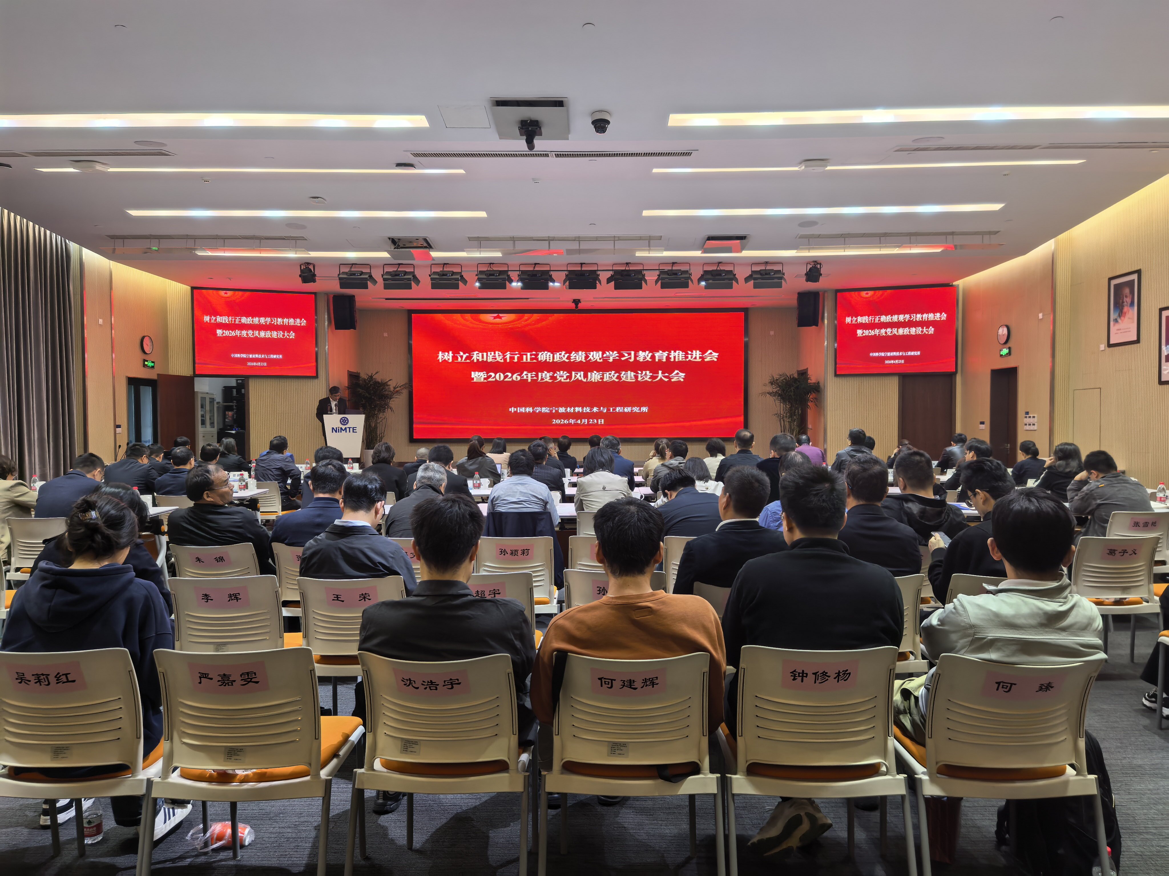 4月23日,中国科学院宁波材料技术与工程研究所召开树立和践行正确政绩观学习教育推进会暨2026年度党风廉政建设大会。领导班子成员、两委委员、所务委员、所务会成员、职能支撑部门负责人、实验室负责人、科研团队负责人、基层党组织书记、纪检委员等100余人参会,会议由纪委书记杨振华主持。