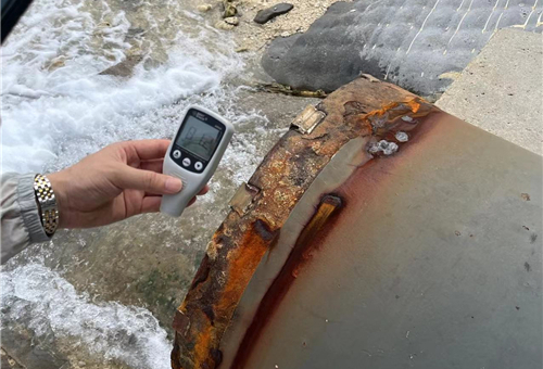 通过对关键位置的调研取样,我们对于前场苛刻的海洋腐蚀环境有了更深层次的认知,而这种认知是从文献阅读中无法获得的。针对发现的问题我们进行了详细的记录,并对于涂层破损程度较高的关键部位,现场开展了涂层性能测试。前场的温度虽然常年恒定在25℃-30℃,但强烈的辐照带给我们的体感温度远远高于30℃,尤其是经过阳光暴晒后的钢架结构,其表面温度高达60℃-70℃,即使带着操作手套还是会有明显的灼热感。在进行拉拔测试时,较高的温度导致测试装置难以固定在测试表面,需要人为固定住试件,并在炎炎烈日下保持长时间不动,我们亲身感受到了实验数据的来之不易。