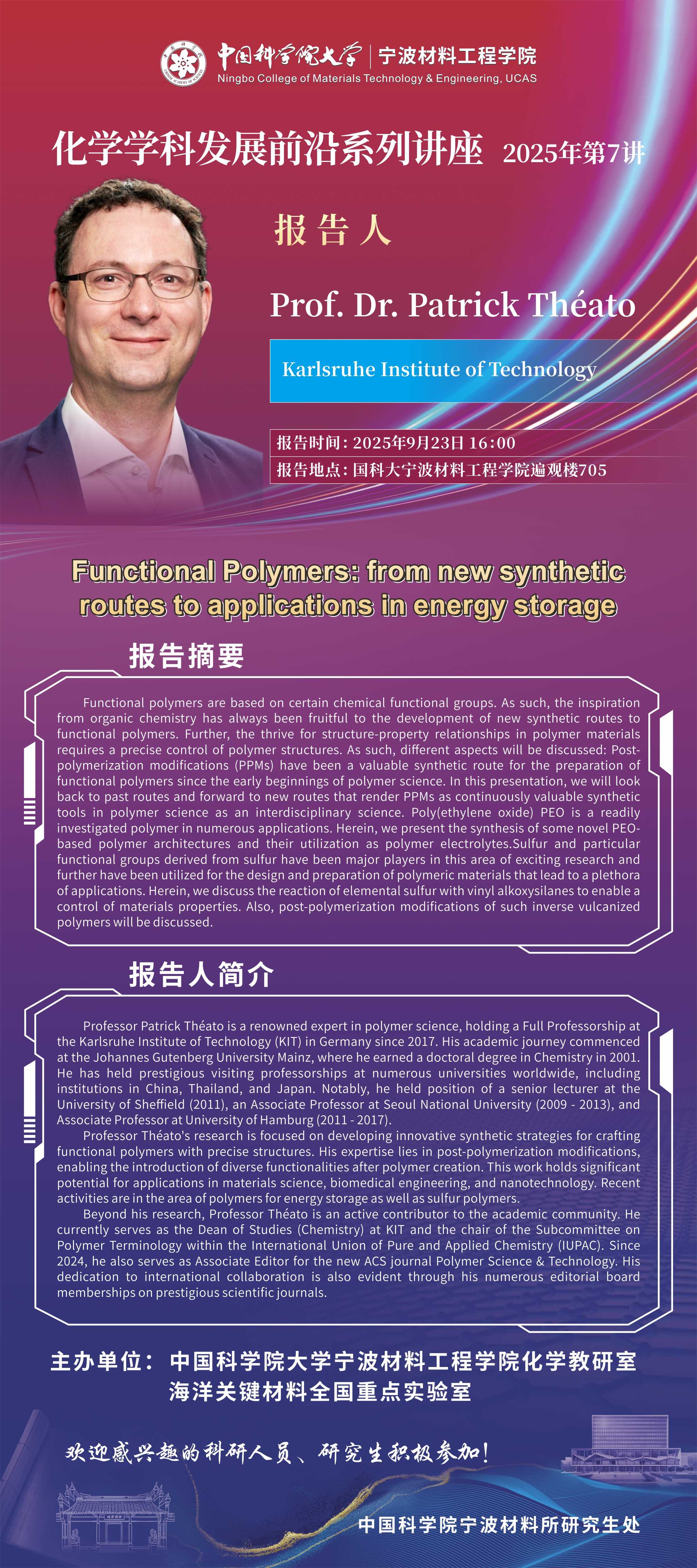 9月23日:Prof. Dr. Patrick Theato:Functional Polymers from new synthetic routes to applications in energy storage 发布:2025-09-19 点赞: 字号:小 大 打印: