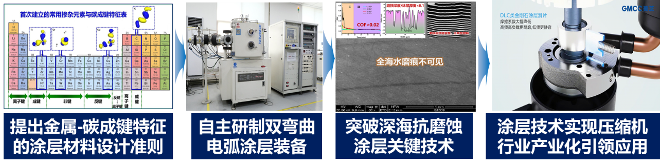 面向深海装备与制冷压缩机动力系统的先进表面防护需求,率先揭示了微量金属掺杂降低碳基涂层内应力的普适物理机制,建立金属–碳成键特征导向的材料设计准则,创制出系列双元金属掺杂碳基涂层新体系。提出了多环境低摩擦碳基涂层表/界面调控新原理,发展悬键钝化、固液适配与致密强韧协同技术,开发了干摩擦、固油与海水等多工况超低摩擦防护涂层材料。自主研制出两类高离化稳定受控电弧复合涂层装备,突破强界面结合与均匀制备延寿关键技术,实现了压缩机领域引领示范应用与深海装备防护涂层自主可控,取得显著经济和社会效益。