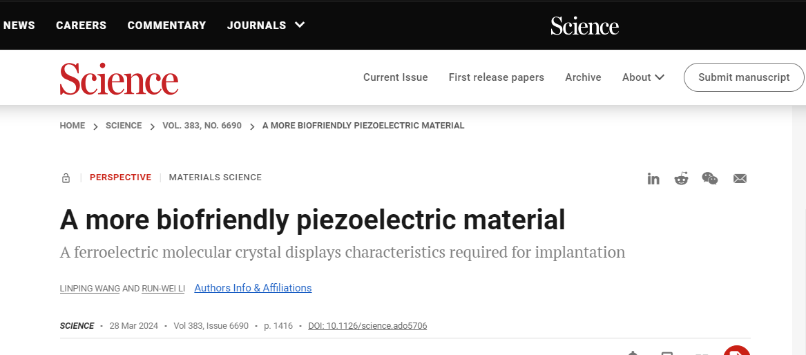 宁波材料所应邀在《科学》发表评述论文“A more biofriendly piezoelectric material”