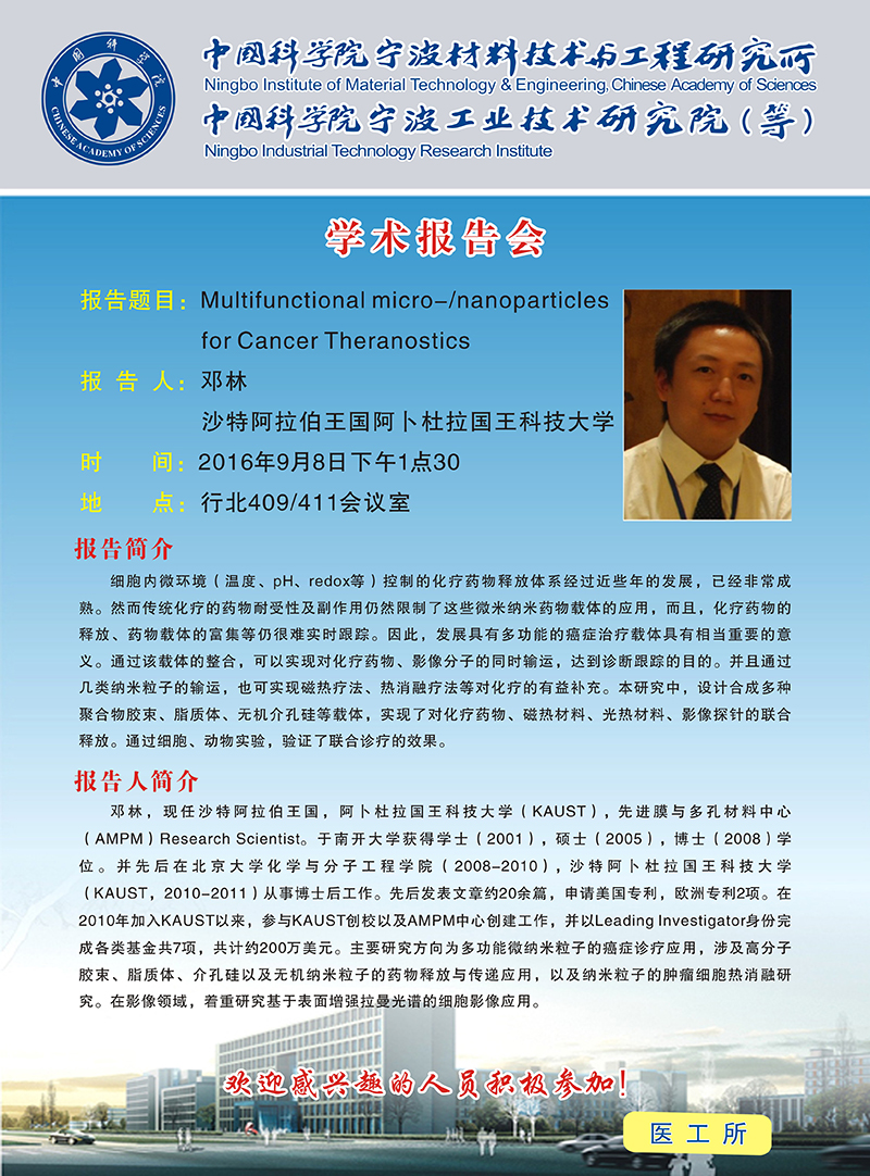9月8日:邓林:Multifunctional micro-/nanoparticles for Cancer Theranostics