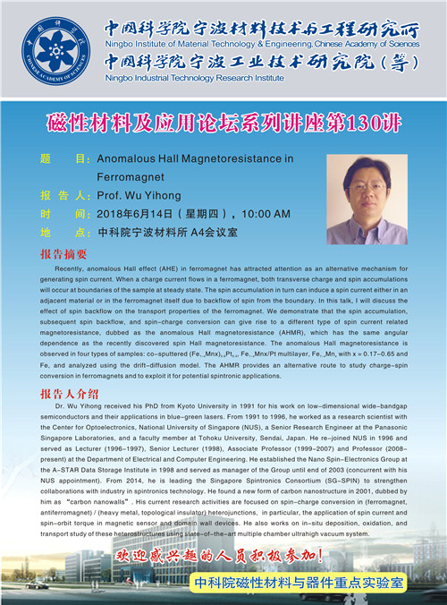 6月14日:吴义宏:Anomalous Hall Magnetoresistance in Ferromagnet