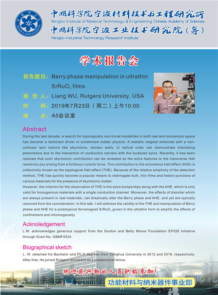 7月23日:Liang WU: Berry phase manipulation in ultrathin SrRuO3 films