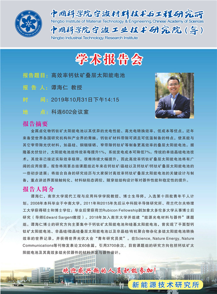 10月31日:谭海仁:高效率钙钛矿叠层太阳能电池