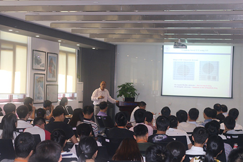 报告中,陈永胜教授从三个方面介绍了石墨烯材料的宏量制备及其在能源储存与转化方面的应用。首先,陈永胜教授分析了硅基材料与石墨烯材料的区别,以及石墨烯材料在透明电极与能源转化方面应用的优势。陈教授提到,石墨烯材料的可控合成将极大影响后续的实验,因此陈教授课题组从2009年开始研究石墨烯材料的制备和有效分散,并将其用作喷墨打印的墨水。其次,为防止石墨烯的堆叠同时又可整合单片石墨烯的优势,陈教授课题组构筑了三维石墨烯材料,首次制备出石墨烯基超级电容器及一系列高比容量石墨烯基的电容器材料,其中全碳超级电容器可兼具高功率密度和超高能量密度。最后,陈永胜教授介绍了其课题组制备的具有零泊松比的体相石墨烯材料,以及颠覆性的研究结果——光直接驱动的石墨烯材料,引起了在座各位的兴趣,此工作有极大可能为以后的太空运输而服务。与会人员就光驱动的原理及疑惑,石墨烯宏量制备的问题和石墨烯基超级电容器中含氧官能团的影响等问题,与陈永胜教授展开了热烈和深入的交流。
