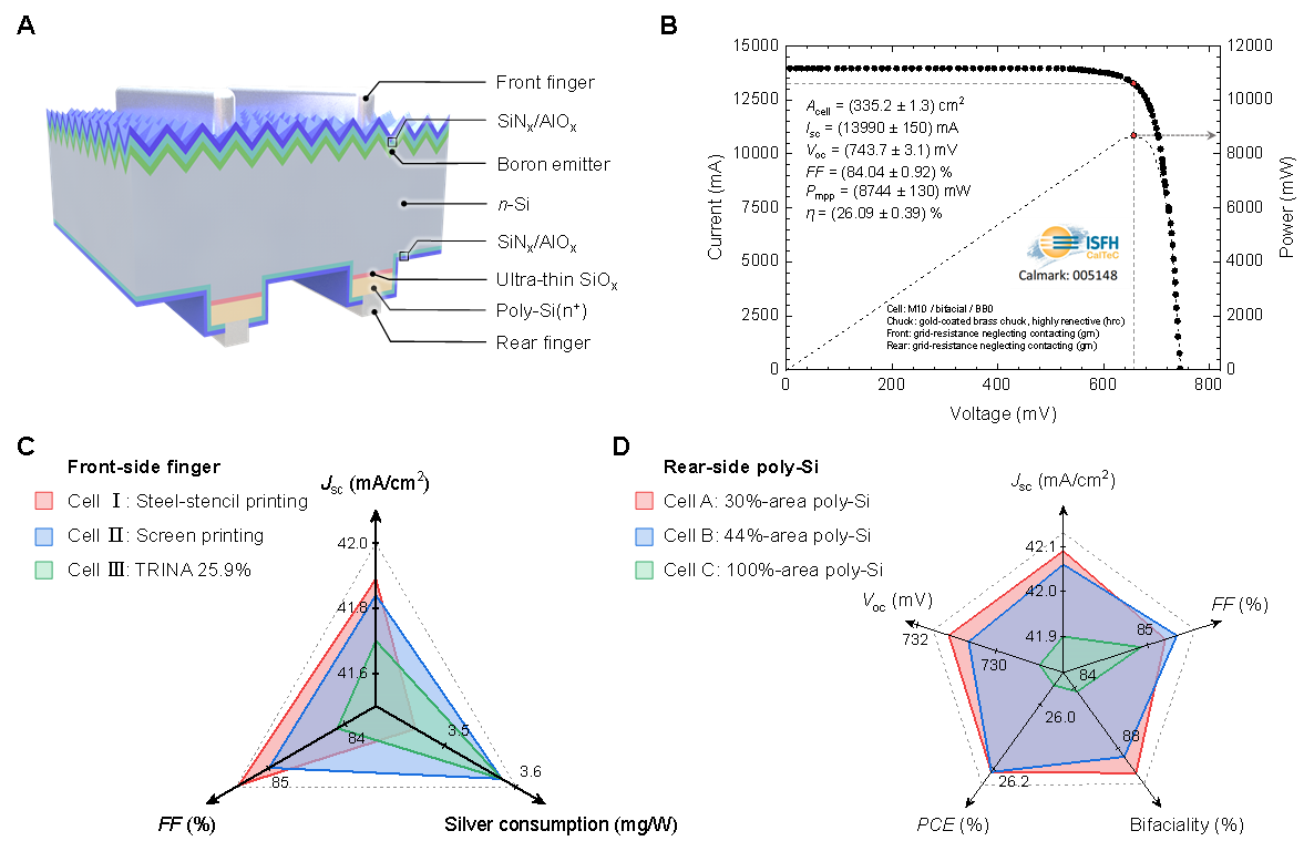 针对上述瓶颈,中国科学院宁波材料技术与工程研究所高效太阳能电池与宽禁带半导体团队在叶继春研究员的带领下,基于前期在TOPCon电池领域的积累(Nat. Energy,2023,8,1250; Energy Environ. Sci. 2021,14, 6406;Adv. Energy Mater.,2022,2203006; Small,2023,1,2304348; Cell Rep. Phys. Sci. 2021,2,1;Sol. RRL: 2021,5, 2100644; 2023,7,2201082; Sol. Energy Mater. Sol. Cells 2021,223,110970; 2021,230,111229; 2022,238,111586; 2022,240,111713; 2022,243,111803; 2022,250, 112047; 2023,257,112354; 2023,257,112393),与捷泰新能源科技有限公司合作提出一项可量产的协同创新方案。该方案通过结合正面高精度钢版印刷技术与背面局部多晶硅接触结构,在工业级M10硅片(面积为335 cm2)上取得了显著突破,实现了认证转换效率高达26.09%的TOPCon电池,同时有效降低了银浆消耗并显著提升了双面率。这一成果标志着TOPCon技术迈向新阶段,为增强其市场竞争力奠定了基础。