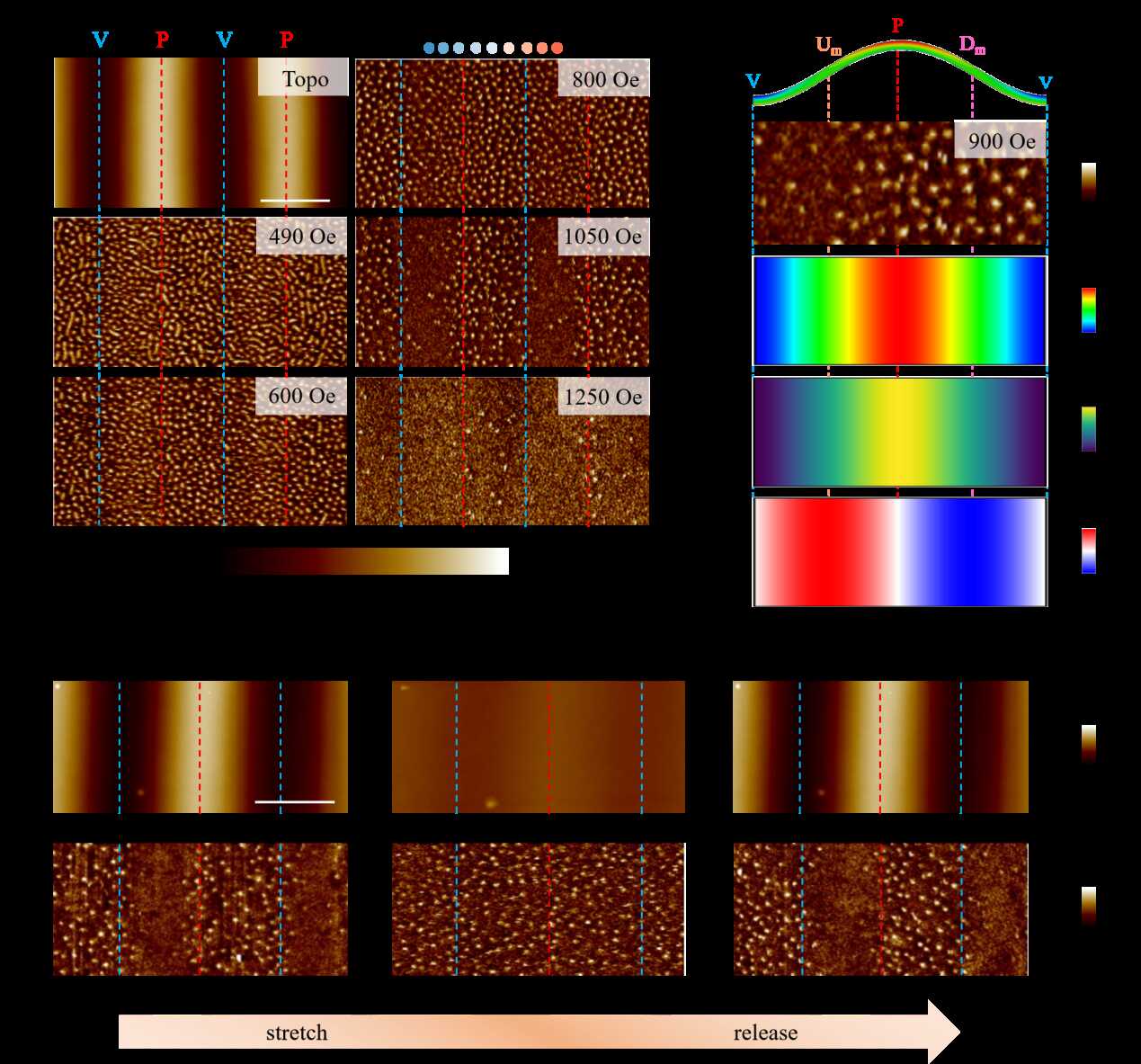 研究中,团队选择具有磁斯格明子结构的Pt/Co/Ta多层膜作为研究对象,采用预拉伸弹性聚二甲基硅氧烷(PDMS)衬底并结合磁控溅射技术,利用薄膜与衬底间的模量差异,在预应变释放后的Pt/Co/Ta薄膜中成功构筑了微褶皱结构,从而引入非均匀应变分布:褶皱结构的波峰位置受到拉伸应变,而波谷位置受到压缩应变,由此产生面内应变梯度。磁力显微镜观测显示,不同磁场下斯格明子的密度与尺寸呈现显著空间非均匀性,并在褶皱波峰两侧出现不对称分布:在负应变梯度区域,斯格明子更易稳定存在,密度更高、尺寸更大;而在正应变梯度区域则相反。利用面内应变梯度,斯格明子密度可在1-13 μm-2范围内连续调节,尺寸调控范围达85-133 nm,该调控效果甚至优于均匀应变的作用。